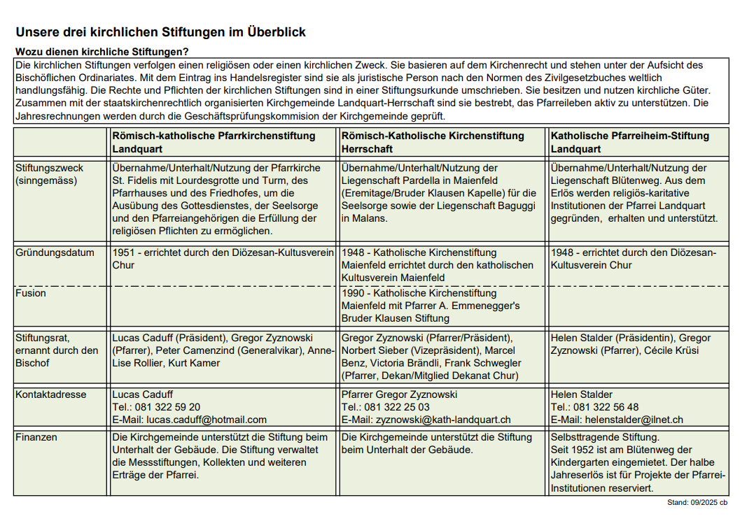 KIRCHLICHE STIFTUNGEN Kirchliche Stiftungen KONTAKT Sekretariat Telefon 081 322 37 48 sekretariat@kath-landquart.ch